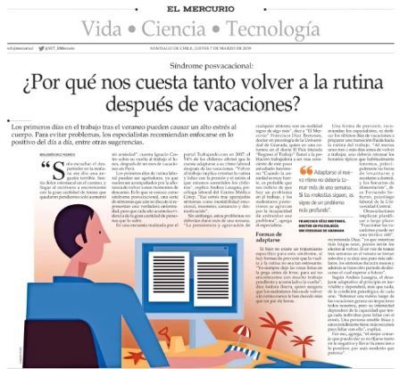 En una encuesta realizada por el portal Trabajando.com en 2017, el 54% de los chilenos afirmó que le cuesta adaptarse a su ritmo laboral después de las vacaciones. «Volver al trabajo implica retomar la rutina y lidiar con la presión y el estrés al que estamos sometidos los chilenos», explica Andrea Lasagna, psicóloga laboral del Centro Médico Cetep. «Ese estrés trae aparejados síntomas como inestabilidad emocional, insomnio, cansancio y desmotivación«.